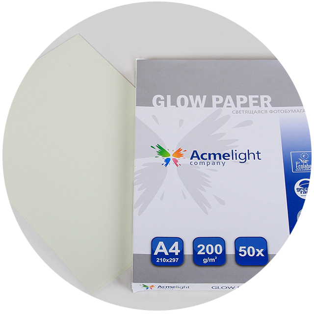 ОПИСАНИЕ: Полностью готовая к использованию специальная бумага, которая имеет свойство накапливать световую энергию от солнечного света или люминесцентных ламп и отдавать ее в виде свечения в полной темноте. Интенсивность свечения в первые 10 мин. - ярк. 480 мкд/м2.